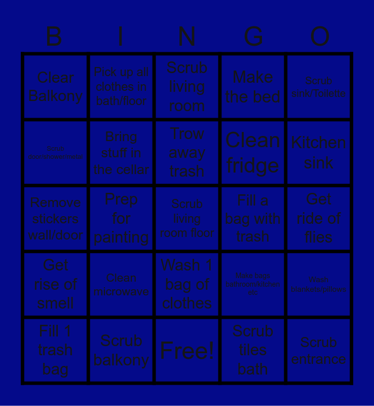 This bingo card has 28 words: Fill 1 trash bag, Fill 1 trash bag, Trow away trash, Scrub tiles bath, Scrub sink/Toilette, Scrub door/shower/metal, Pick up all clothes in bath/floor, Wash 1 bag of clothes, Fill a bag with trash, Scrub entrance, Remove stickers wall/door, Bring stuff in the cellar, Free!, Make bags bathroom/kitchen etc, Kitchen sink, Scrub kitchen floor, Clean microwave, Scrub living room, Make the bed, Wash blankets/pillows, Clear Balkony, Scrub balkony, Scrub living room floor, Clean fridge, Get ride of flies, Get rise of smell, Prep for painting and Cook all kitchen utensils.