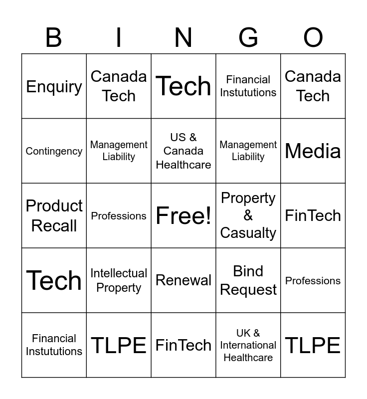 This bingo card has 42 words: CFC USA, Canada Tech, Contingency, Bind Request, FinTech, Financial Instututions, Intellectual Property, Life Science, Management Liability, Media, Product Recall, Professions, Free!, Property & Casualty, TLPE, Tech, UK & Internatioanly Healthcare, US & Canada Healthcare, CFC USA, Canada Tech, Contingency, Cyber, FinTech, Financial Instututions, Renewal, Life Science, Management Liability, Media, Product Recall, Professions, Property & Casualty, TLPE, Tech, UK & International Healthcare, US & Canada Healthcare, Crime, Underwriter, Renewal, New Business, Bind Request, Enquiry and Logging.