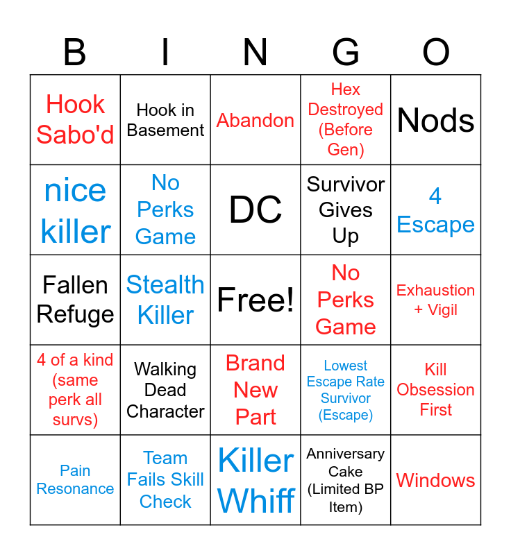 This bingo card has 81 words: E, Clown, DC, Hit on Hook, Killer Leaves Chase, TBAG, Flashlight Save, Map Offering, Tunneling, Hatch Escape, Pain Resonance, NOED, Free!, Hex Destroyed (Before Gen), Mori, Hook Sabo'd, Slugged, Brand New Part, 4k, 4 Escape, Escape With New Item, Hook in Basement, Survivor Gives Up, Nods, nice killer, Finesse, Gen Rushed, P100, TTV, Pallet Stun, Stealth Killer, Sus Name, Lowest Escape Rate Survivor (Escape), Windows, 4 of a kind (same perk all survs), Team Fails Skill Check, Boon, Lowest Kill Rate Killer 4k, Corrupt, 4 Gen Perks, Walking Dead Character, Double Iri, Stealthy Survivor(s), Killer <2% Pick Rate, Fallen Refuge, Eyrie of Crows, Abandon, Anniversary Cake (Limited BP Item), Hex/Boon Name, Double Exhaustion, Finishing Mori, Bamboozle, Wesker, Grabbed (gen, locker window), Decisive Strike, Shirtless Survivor, Exposed Down, Jim the Pole, Indoor Map, Escape Random Build, Killer Whiff, 4k Random Build, Survivor Dead Before 4 Gens, Survivor Drops Item, Interrupt Survivor on Door, Syringe, Hatch Offering, Fazbear's Pizza, Luck Offering, Lara Cosmetic, Grab Survivor in Security Door, No Perks Game, Exhaustion + Vigil, Ghoul, Friends 'til the End, Play Lowest Pick Rate Killer, Bring at least 3 of same item, Kill Obsession First, Wait in Exit Gate, No Perks Game and Fog Vial Escape.