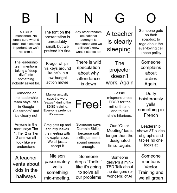 This bingo card has a free space and 29 words: A teacher vents about kids in the hallways, Horner plays with his hair like he’s in a shampoo commercial, Manier actually says the word “sexual” during the EBGB training. Everyone pretends it’s normal., Someone mentions intervention as a solution to all teacher problems, MTSS is mentioned. No one’s sure what it does, but it sounds important, so we’ll roll with it., Any other random educational acronym is mentioned and we still don’t know what it stands for., Kragel whips his keys around like he’s in a low-budget action movie, Greg gets up and abruptly leaves the meeting with no explanation. We all just…accept it, Jessie mispronounces EBGB for the millionth time and thinks she’s hilarious., Nielson passionately yells something mid-meeting., Duffy boisterously yells something in French, Someone mentions Vector Training and we all groan, Someone drops “Toolkit” like it’s going to solve all our problems, Someone delivers a mini-TED Talk about the dangers (or wonders) of AI, Someone complains about tardies. Again., Someone mentions 10-year-takeaways and we all act like we are listening., Someone says Durable Skills, because soft skills just don’t sound serious enough., Anyone in the room says Tier 1, Tier 2 or Tier 3 and we all look like we understand, Someone gets on their soapbox to rage about the ever-loving cell phone policy, Someone on the leadership team says, “It’s in Google Classroom” and it’s clearly not, Our “Quick Meeting” lasts longer than the designated time…again., Everyone stops listening and stares longingly at the clock., The projector doesn’t work. Again, The leadership team mentions taking a “deep dive” into something nobody asked for., A teacher is clearly sleeping., The font on the presentation is unreadably small, but we pretend it’s fine, Leadership shows 87 slides of graphs and tables no one looks at, There is wild speculation about why attendance is down and Greg mentions love, and unpacks his entire emotional suitcase on the topic..