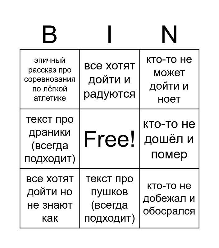 This bingo card has a free space and 8 words: кто-то не дошёл и помер, кто-то не может дойти и ноет, все хотят дойти и радуются, все хотят дойти но не знают как, эпичный рассказ про соревнования по лёгкой атлетике, кто-то не добежал и обосрался, текст про драники (всегда подходит) and текст про пушков (всегда подходит).