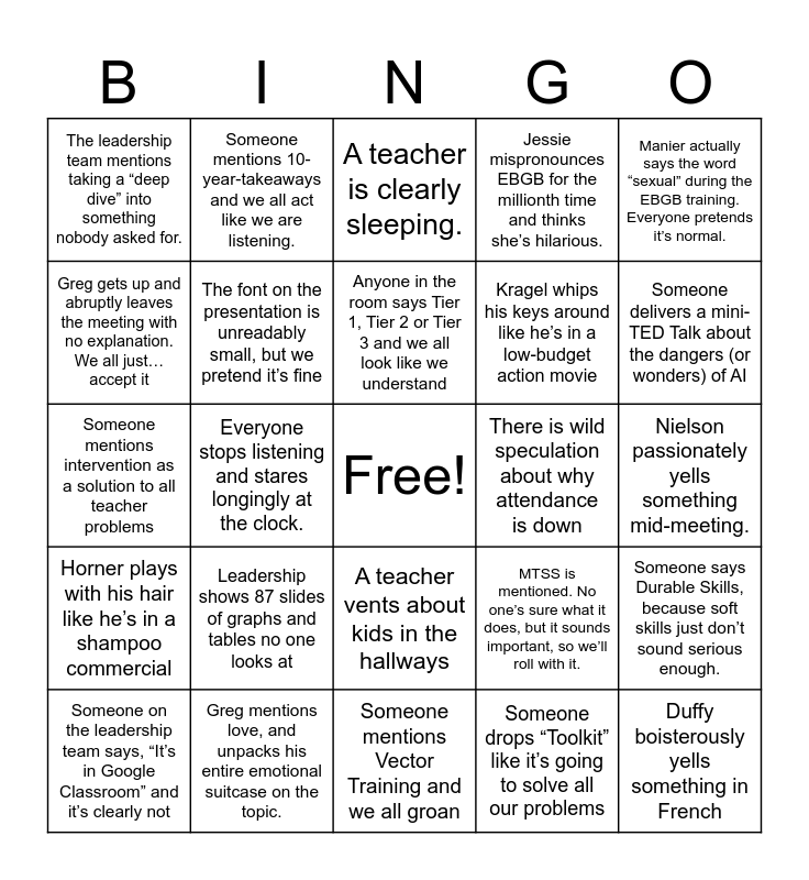 This bingo card has a free space and 29 words: Someone on the leadership team says, “It’s in Google Classroom” and it’s clearly not, Our “Quick Meeting” lasts longer than the designated time…again., Everyone stops listening and stares longingly at the clock., The projector doesn’t work. Again, The leadership team mentions taking a “deep dive” into something nobody asked for., A teacher is clearly sleeping., The font on the presentation is unreadably small, but we pretend it’s fine, Leadership shows 87 slides of graphs and tables no one looks at, There is wild speculation about why attendance is down, Greg mentions love, and unpacks his entire emotional suitcase on the topic., Nielson passionately yells something mid-meeting., Duffy boisterously yells something in French, Someone mentions Vector Training and we all groan, Someone drops “Toolkit” like it’s going to solve all our problems, Someone delivers a mini-TED Talk about the dangers (or wonders) of AI, Someone complains about tardies. Again., A teacher vents about kids in the hallways, Horner plays with his hair like he’s in a shampoo commercial, Manier actually says the word “sexual” during the EBGB training. Everyone pretends it’s normal., Someone mentions intervention as a solution to all teacher problems, MTSS is mentioned. No one’s sure what it does, but it sounds important, so we’ll roll with it., Any other random educational acronym is mentioned and we still don’t know what it stands for., Kragel whips his keys around like he’s in a low-budget action movie, Greg gets up and abruptly leaves the meeting with no explanation. We all just…accept it, Jessie mispronounces EBGB for the millionth time and thinks she’s hilarious., Someone mentions 10-year-takeaways and we all act like we are listening., Someone says Durable Skills, because soft skills just don’t sound serious enough., Anyone in the room says Tier 1, Tier 2 or Tier 3 and we all look like we understand and Someone gets on their soapbox to rage about the ever-loving cell phone policy.