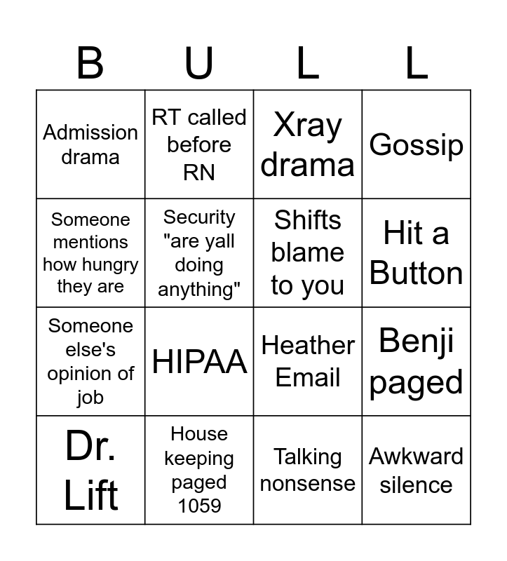 This bingo card has 16 words: House keeping paged 1059, Benji paged, Xray drama, Admission drama, Someone else's opinion of job, RT called before RN, Heather Email, Talking nonsense, Someone mentions how hungry they are, Security "are yall doing anything", Dr. Lift, Gossip, HIPAA, Hit a Button, Shifts blame to you and Awkward silence.