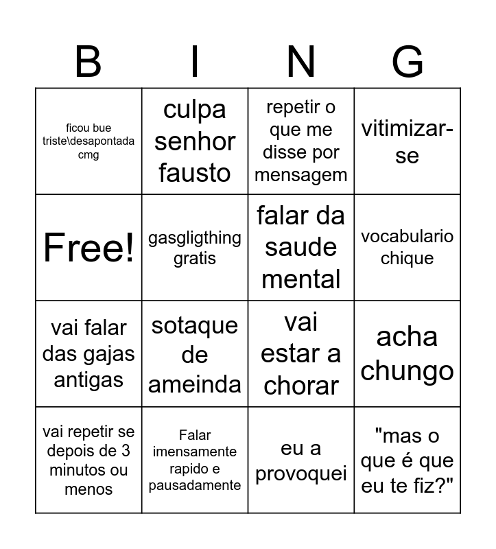 This bingo card has 16 words: Falar imensamente rapido e pausadamente, acha chungo, repetir o que me disse por mensagem, ficou bue triste\desapontada cmg, vai falar das gajas antigas, culpa senhor fausto, vai estar a chorar, eu a provoquei, Free!, gasgligthing gratis, vai repetir se depois de 3 minutos ou menos, vitimizar-se, sotaque de ameinda, vocabulario chique, falar da saude mental and "mas o que é que eu te fiz?".