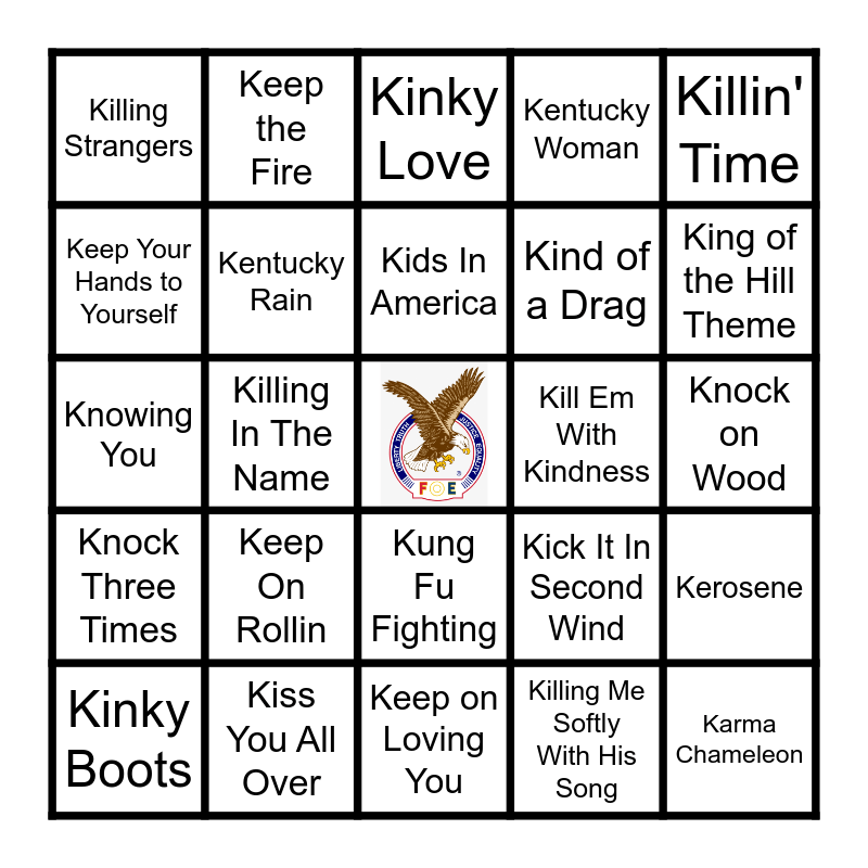 This bingo card has a free space and 51 words: I Kissed A Girl, Karma Chameleon, Kashmir - Remaster, Keep on Loving You, Keep On Rollin, Keep The Faith, Keep the Fire, Keep the Fire Burnin', Keep Your Hands to Yourself, Keep Yourself Alive, Kentucky Rain, Kentucky Woman, Kerosene, Kick It In Second Wind, Kick It In The Sticks, Kick It Out, Kids In America, Kill Em With Kindness, Killer Queen - Remastered 2011, Killin' Time, Killing In The Name, Killing Me Softly With His Song, Killing Strangers, Kind of a Drag, King of Anything, King Of Pain, King of the Hill Theme, King Of The Road, Kinky Boots, Kinky Love, Kiss and Say Goodbye, Kiss and Tell (7 Edit), Kiss from a Rose, Kiss Me, Kiss Me Thru The Phone, Kiss You All Over, Kisses Sweeter Than Wine, Knives Of New Orleans, Knives Out, Knock 'Em Dead Kid, Knock on Wood, Knock Three Times, Knockin' Boots, Knockin' On Heaven's Door, Knocks Me Off My Feet, Knowing Me Knowing You, Knowing You, Kooks - 2015 Remaster, Kryptonite, Kung Fu Fighting and The King of Wishful Thinking.