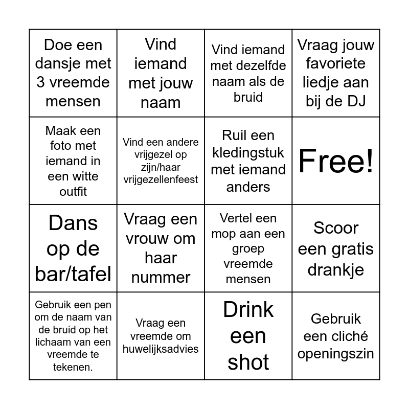 This bingo card has 17 words: Drink een shot, Gebruik een pen om de naam van de bruid op het lichaam van een vreemde te tekenen., Vind iemand met dezelfde naam als de bruid, Doe een dansje met 3 vreemde mensen, Vraag een vrouw om haar nummer, Vraag jouw favoriete liedje aan bij de DJ, Scoor een gratis drankje, Ruil een kledingstuk met iemand anders, Free!, Vind een andere vrijgezel op zijn/haar vrijgezellenfeest, Vraag een vreemde om huwelijksadvies, Vertel een mop aan een groep vreemde mensen, Maak een foto met iemand in een witte outfit, Vind iemand met jouw naam, Dans op de bar/tafel, Breng een toost uit op de bruid and Gebruik een cliché openingszin.