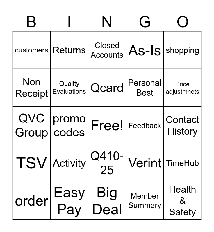 This bingo card has a free space and 24 words: Activity, Easy Pay, Qcard, order, shopping, customers, Non Receipt, Returns, Feedback, Q410-25, Personal Best, QVC Group, Verint, TimeHub, Quality Evaluations, Member Summary, Contact History, Closed Accounts, Price adjustmnets, promo codes, Health & Safety, TSV, As-Is and Big Deal.
