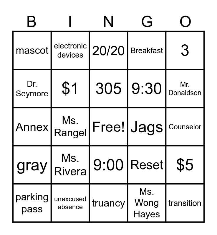 This bingo card has a free space and 24 words: Ms. Rivera, unexcused absence, 305, parking pass, 3, mascot, Dr. Seymore, electronic devices, Jags, 9:00, 9:30, Annex, Reset, $5, $1, Ms. Wong Hayes, Counselor, 20/20, Mr. Donaldson, Ms. Rangel, transition, gray, Breakfast and truancy.