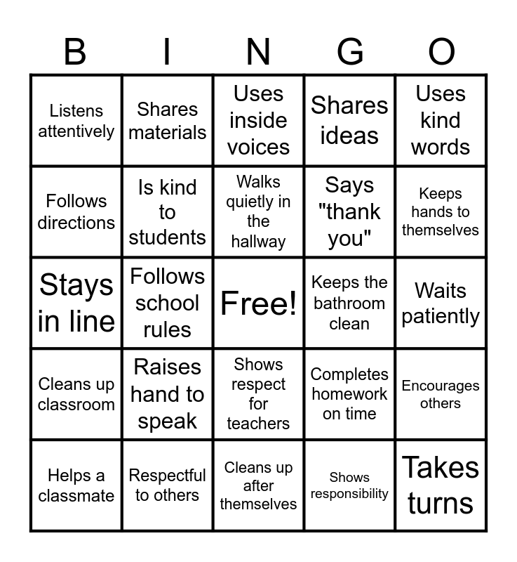 This bingo card has a free space and 25 words: Raises hand to speak, Cleans up after themselves, Walks quietly in the hallway, Helps a classmate, Uses kind words, Listens attentively, Follows directions, Shares materials, Keeps the bathroom clean, Shows respect for teachers, Says "thank you", Stays in line, Completes homework on time, Encourages others, Is kind to students, Participates in class, Waits patiently, Uses inside voices, Keeps hands to themselves, Follows school rules, Takes turns, Respectful to others, Cleans up classroom, Shares ideas and Shows responsibility.