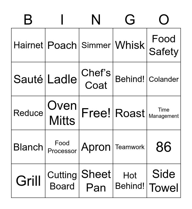 This bingo card has a free space and 28 words: 86, On the Fly, Behind!, Hot Behind!, Sauté, Simmer, Poach, Blanch, Roast, Grill, Reduce, Whisk, Cutting Board, Sheet Pan, Colander, Stand Mixer, Food Processor, Ladle, Chef’s Coat, Apron, Hairnet, Non-Slip Shoes, Side Towel, Oven Mitts, Time Management, Teamwork, Food Safety and Knife Skills.