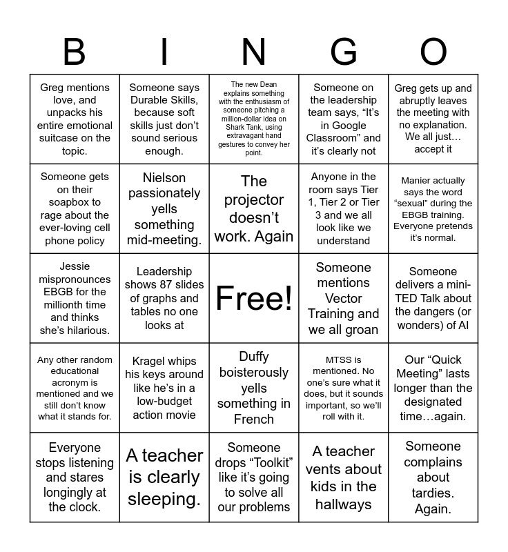 This bingo card has a free space and 30 words: A teacher is clearly sleeping., The font on the presentation is unreadably small, but we pretend it’s fine, Leadership shows 87 slides of graphs and tables no one looks at, There is wild speculation about why attendance is down, Greg mentions love, and unpacks his entire emotional suitcase on the topic., The new Dean explains something with the enthusiasm of someone pitching a million-dollar idea on Shark Tank, using extravagant hand gestures to convey her point., Nielson passionately yells something mid-meeting., Duffy boisterously yells something in French, Someone mentions Vector Training and we all groan, Someone drops “Toolkit” like it’s going to solve all our problems, Someone delivers a mini-TED Talk about the dangers (or wonders) of AI, Someone complains about tardies. Again., A teacher vents about kids in the hallways, Horner plays with his hair like he’s in a shampoo commercial, Manier actually says the word “sexual” during the EBGB training. Everyone pretends it’s normal., Someone mentions intervention as a solution to all teacher problems, MTSS is mentioned. No one’s sure what it does, but it sounds important, so we’ll roll with it., Any other random educational acronym is mentioned and we still don’t know what it stands for., Kragel whips his keys around like he’s in a low-budget action movie, Greg gets up and abruptly leaves the meeting with no explanation. We all just…accept it, Jessie mispronounces EBGB for the millionth time and thinks she’s hilarious., Someone mentions 10-year-takeaways and we all act like we are listening., Someone says Durable Skills, because soft skills just don’t sound serious enough., Anyone in the room says Tier 1, Tier 2 or Tier 3 and we all look like we understand, Someone gets on their soapbox to rage about the ever-loving cell phone policy, Someone on the leadership team says, “It’s in Google Classroom” and it’s clearly not, Our “Quick Meeting” lasts longer than the designated time…again., Everyone stops listening and stares longingly at the clock., The projector doesn’t work. Again and The leadership team mentions taking a “deep dive” into something nobody asked for..