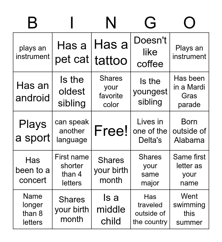 This bingo card has a free space and 24 words: First name shorter than 4 letters, Shares your birth month, Shares your favorite color, Name longer than 8 letters, Plays an instrument, plays an instrument, Has an android, Has a pet cat, Lives in one of the Delta's, Shares your birth month, Is the youngest sibling, Plays a sport, Shares your same major, Same first letter as your name, Is the oldest sibling, Has traveled outside of the country, Born outside of Alabama, Has a tattoo, Has been in a Mardi Gras parade, can speak another language, Went swimming this summer, Has been to a concert, Doesn't like coffee and Is a middle child.