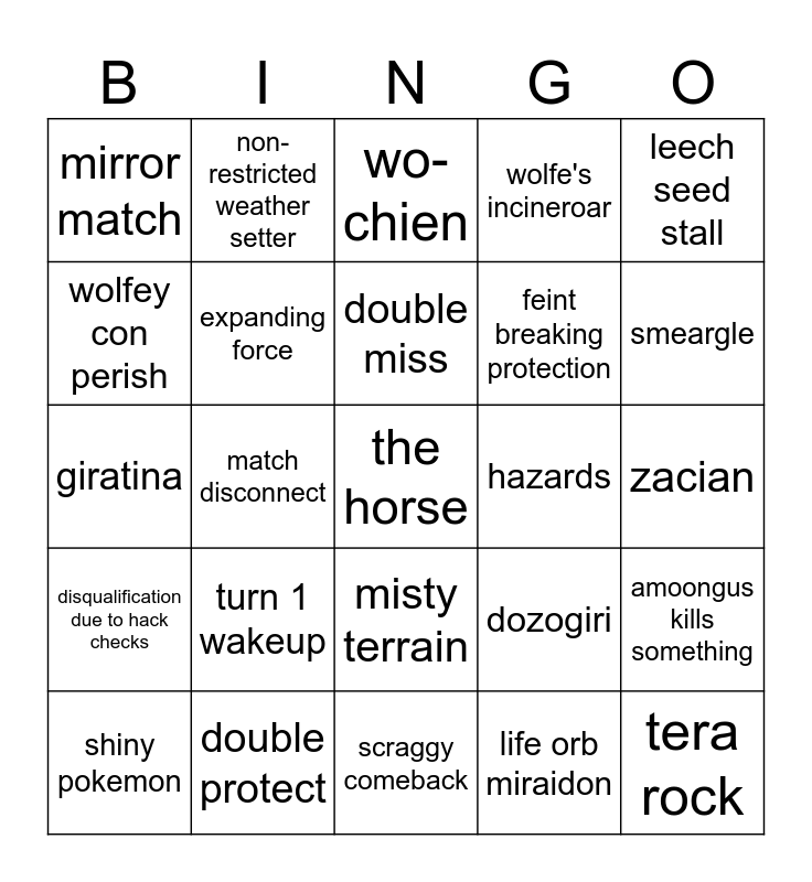 This bingo card has a free space and 24 words: turn 1 wakeup, double protect, double miss, shiny pokemon, leech seed stall, mirror match, wolfey con perish, non-restricted weather setter, hazards, misty terrain, feint breaking protection, giratina, dozogiri, amoongus kills something, expanding force, life orb miraidon, zacian, wo-chien, smeargle, match disconnect, tera rock, disqualification due to hack checks, wolfe's incineroar and scraggy comeback.