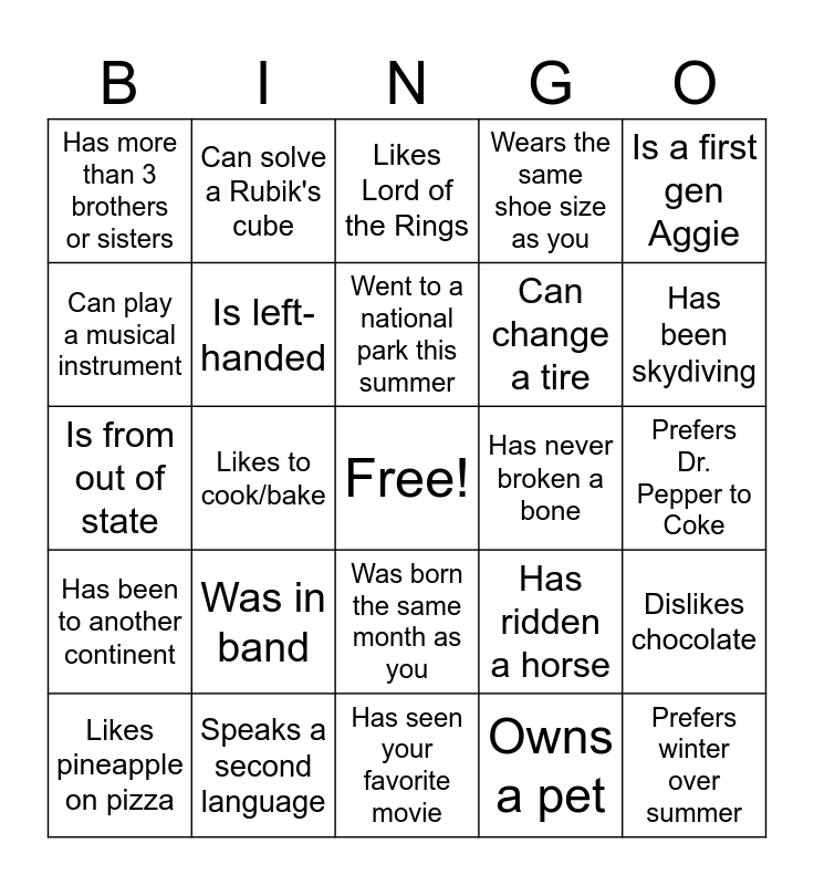 This bingo card has a free space and 24 words: Was in band, Speaks a second language, Went to a national park this summer, Likes pineapple on pizza, Is a first gen Aggie, Has more than 3 brothers or sisters, Can play a musical instrument, Can solve a Rubik's cube, Has never broken a bone, Was born the same month as you, Can change a tire, Is from out of state, Has ridden a horse, Dislikes chocolate, Is left-handed, Owns a pet, Prefers Dr. Pepper to Coke, Likes Lord of the Rings, Has been skydiving, Likes to cook/bake, Prefers winter over summer, Has been to another continent, Wears the same shoe size as you and Has seen your favorite movie.
