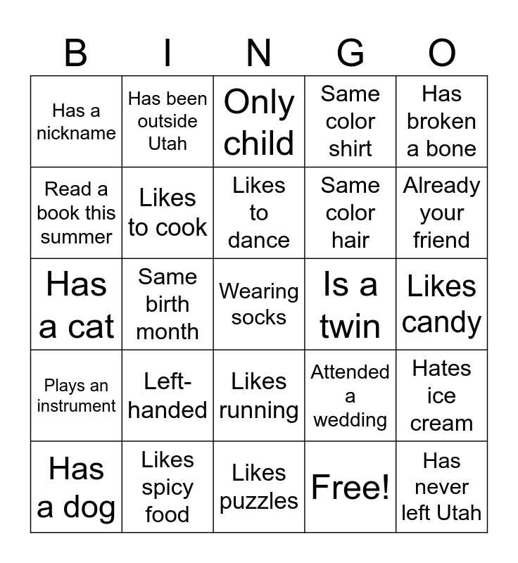 This bingo card has 32 words: Free!, Knows another language, Same birth month, Loves winter, Plays an instrument, Likes to cook, Has broken a bone, Hates ice cream, Has been outside Utah, Has never left Utah, Likes to dance, Only child, Has a brother, Has a sister, Is a twin, On a sports team, Has a dog, Has a cat, Likes running, Left-handed, Attended a wedding, Likes drawing, Likes candy, Likes spicy food, Wearing socks, Same color shirt, Same color hair, Read a book this summer, Has a nickname, Likes puzzles, You met today and Already your friend.