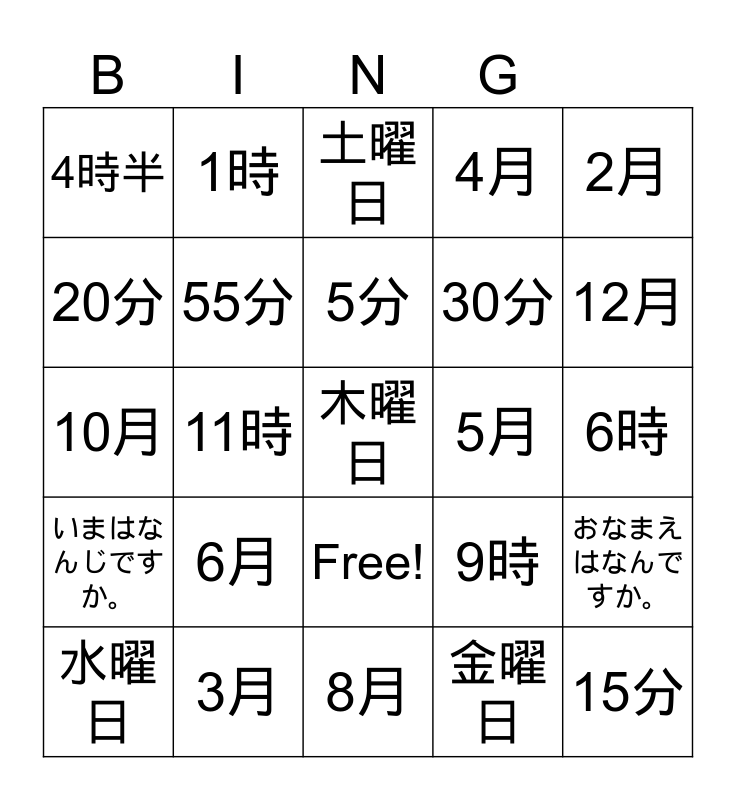 This bingo card has 43 words: 月曜日, 木曜日, 火曜日, 水曜日, 日曜日, 金曜日, 土曜日, 1月, 2月, 3月, 4月, 5月, Free!, 6月, 7月, 8月, 9月, 10月, 11月, 12月, 1時, 2時, 3時, 4時半, 5時, 6時, 7時半, 8時, 9時, いまはなんじですか。, なんさいですか。, おなまえはなんですか。, 10時, 11時, 12時, 10分, 15分, 5分, 20分, 30分, 45分, 55分 and これはなんですか。.