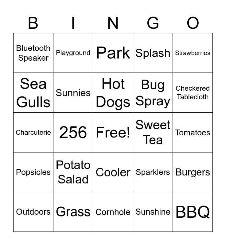 This bingo card has a free space and 75 words: Lemonade, Trees, Park, Flowers, By the Lake, Frisbee, Swimsuit, Vacation, Solstice, Cricket, Fetch, Fireworks, Hot Dogs, Sea Gulls, Beach, 256, Corn, BBQ, Ants, Strawberries, Relaxing, Charcuterie, Sunnies, Playground, Splash, Play Catch, Sailboat, Ice Cream Truck, Charcoal, Baguette, Pasta Salad, Picnic Table, Sunscreen, Sparklers, Checkered Tablecloth, Bug Spray, Swan Boat, Taylor Swift, Tomatoes, Sunshine, Sandwich, Volleyball, Shade, Watermelon, Grill, Pigeons, Outdoors, Bluetooth Speaker, Bubbles, Birds, Rained Out, Cooler, Sunburn, Picnic Basket, Cider, Epperson, Napkins, Boombox, Mosquitos, Softball, Potato Salad, Laughing, Family, Fruit Salad, Blanket, Sweet Tea, Kites, Trampoline, Friends, Burgers, Popsicles, Grass, Kool-Aid, Cornhole and Baseball.