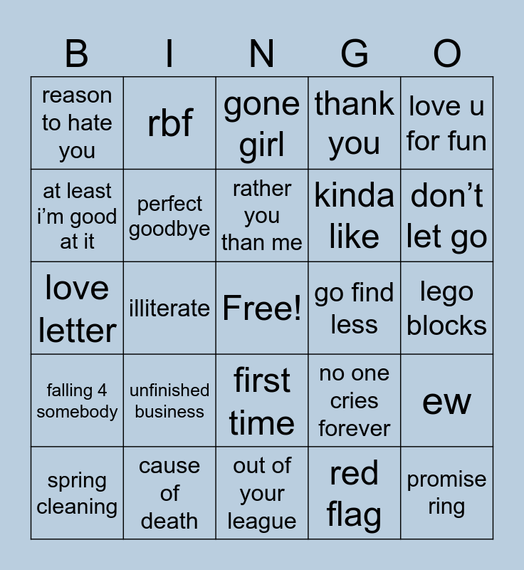 This bingo card has a free space and 29 words: spring cleaning, rocket science, illiterate, good enough, reason to hate you, gone girl, perfect goodbye, unfinished business, go find less, cause of death, lego blocks, promise ring, out of your league, red flag, don’t let go, driving weather, first time, falling 4 somebody, love u for fun, love letter, no one cries forever, f you matthew, kinda like, at least i’m good at it, thank you, rbf, ew, rather you than me and inside out.