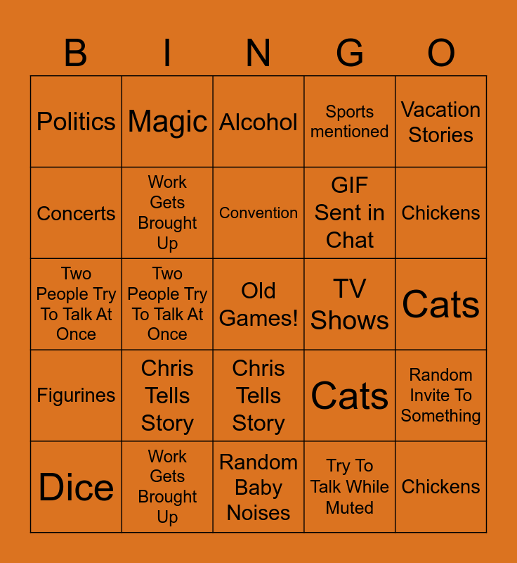 ⚠ This card has duplicate items: Dragon's Lair (2), Chickens (2), Dice (2), Random Baby Noises (2), Chris Tells Story (2), Figurines (2), Magic (2), Concerts (2), Book Club (2), Work Gets Brought Up (2), Sports mentioned (2), Random Invite To Something (2), Cats (2), Movies (2), Food/Baking (2), Convention (2), TV Shows (2), Alcohol (2), Vacation Stories (2), Two People Try To Talk At Once (2), Try To Talk While Muted (2), Politics (2), GIF Sent in Chat (2)