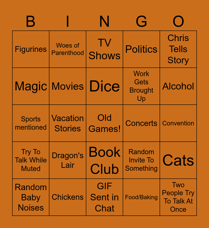 This bingo card has a free space and 24 words: Dragon's Lair, Chickens, Dice, Random Baby Noises, Chris Tells Story, Figurines, Magic, Woes of Parenthood, Concerts, Book Club, Work Gets Brought Up, Sports mentioned, Random Invite To Something, Cats, Movies, Food/Baking, Convention, TV Shows, Alcohol, Vacation Stories, Two People Try To Talk At Once, Try To Talk While Muted, Politics and GIF Sent in Chat.
