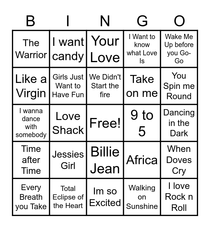 This bingo card has a free space and 40 words: Don't Stop Believin', I wanna dance with somebody, Danger Zone, Girls Just Want to Have Fun, Total Eclipse of the Heart, Billie Jean, We Didn't Start the fire, Livin on a Prayer, Wake Me Up before you Go-Go, Time after Time, Love Shack, I Want to know what Love Is, I love Rock n Roll, Dancing in the Dark, 9 to 5, Jessies Girl, Lets hear it for the Boy, The Warrior, Red Red Wine, Your Love, When Doves Cry, Walking on Sunshine, Take on me, Like a Virgin, Hungry like the Wolf, Call Me, Nothing compares 2 U, Sunglasses at Night, Manic Monday, Come on Eileen, In the Air Tonight, Every Breath you Take, Purple Rain, Africa, You Spin me Round, Im so Excited, We Built this City, You Dropped a Bomb on me, I want candy and Electric Avenue.