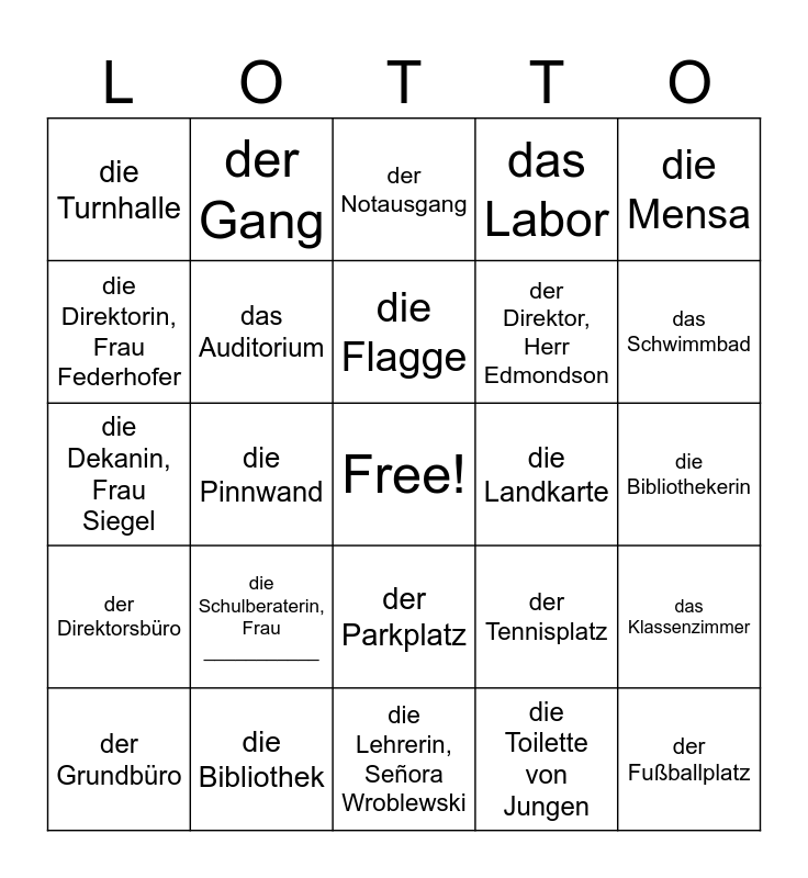 This bingo card has a free space and 34 words: die Toilette von Mädchen, die Toilette von Jungen, die Toilette von allen, der Direktor, Herr Carter, der Direktorsbüro, das Auditorium, die Mensa, der Grundbüro, der Gang, das Schließfach, die Flagge, der Notausgang, der Trinkbrunnen, die Treppen, die Landkarte, das Schwimmbad, die Bibliothek, die Dekanin, Frau Siegel, die Schulberaterin, Frau ___________, der Tennisplatz, der Parkplatz, der Baseballplatz, die Turnhalle, die Bibliothekerin, die Lehrerin, Señora Wroblewski, der Fußballplatz, das Labor, der Fahrstuhl, der Direktor, Herr Edmondson, die Direktorin, Frau Federhofer, das AED Gerät, die Pinnwand, das Klassenzimmer and das Lehrerzimmer.
