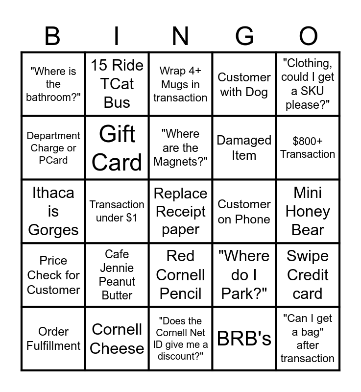 This bingo card has 25 words: Cafe Jennie Peanut Butter, "Does the Cornell Net ID give me a discount?", "Where are the Magnets?", Order Fulfillment, "Clothing, could I get a SKU please?", "Where is the bathroom?", Department Charge or PCard, 15 Ride TCat Bus, Customer on Phone, Red Cornell Pencil, Damaged Item, Ithaca is Gorges, "Where do I Park?", Swipe Credit card, Gift Card, "Can I get a bag" after transaction, Mini Honey Bear, Wrap 4+ Mugs in transaction, $800+ Transaction, Transaction under $1, Replace Receipt paper, Cornell Cheese, Price Check for Customer, Customer with Dog and BRB's.