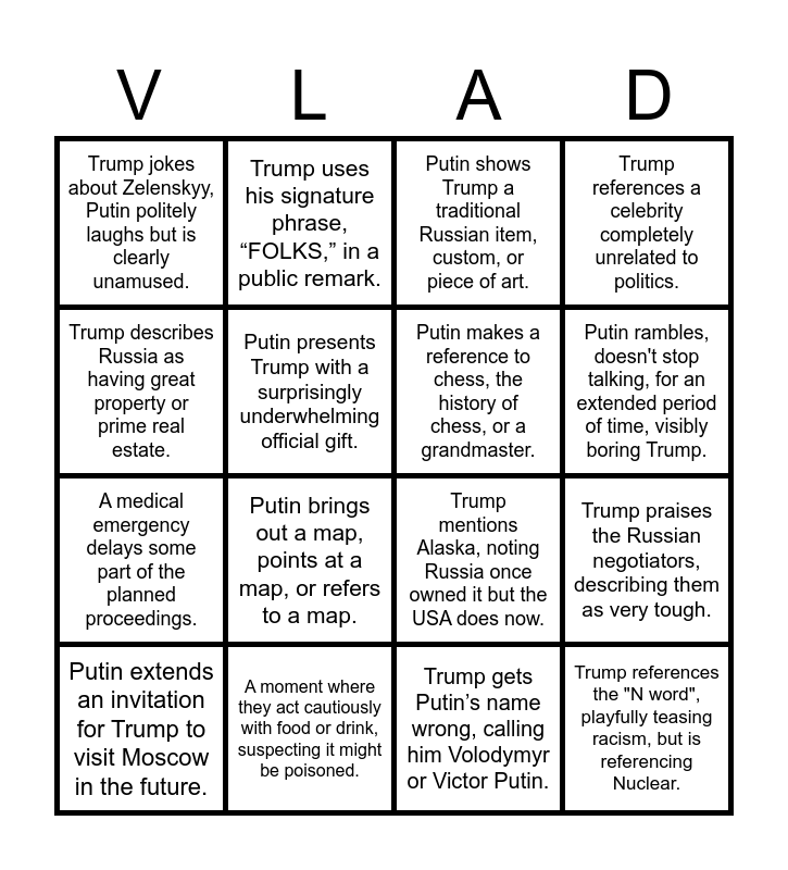 This bingo card has 16 words: A moment where they act cautiously with food or drink, suspecting it might be poisoned., Trump praises the Russian negotiators, describing them as very tough., Putin shows Trump a traditional Russian item, custom, or piece of art., Trump jokes about Zelenskyy, Putin politely laughs but is clearly unamused., A medical emergency delays some part of the planned proceedings., Trump uses his signature phrase, “FOLKS,” in a public remark., Trump mentions Alaska, noting Russia once owned it but the USA does now., Trump gets Putin’s name wrong, calling him Volodymyr or Victor Putin., Trump describes Russia as having great property or prime real estate., Putin presents Trump with a surprisingly underwhelming official gift., Putin extends an invitation for Trump to visit Moscow in the future., Trump references a celebrity completely unrelated to politics., Putin brings out a map, points at a map, or refers to a map., Putin rambles, doesn't stop talking, for an extended period of time, visibly boring Trump., Putin makes a reference to chess, the history of chess, or a grandmaster. and Trump references the "N word", playfully teasing racism, but is referencing Nuclear..