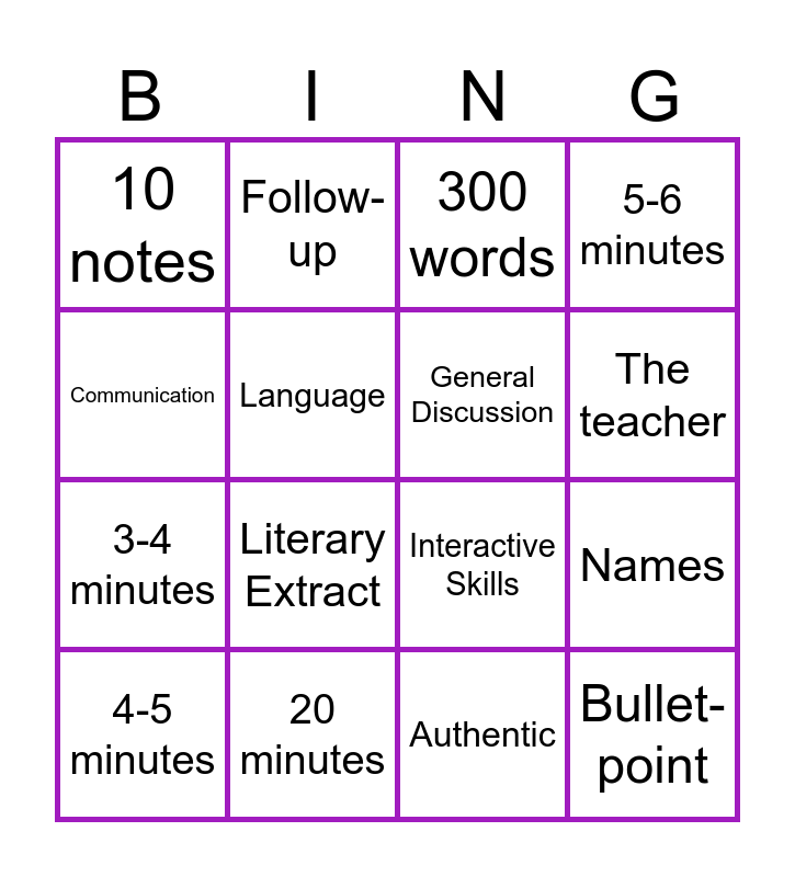 This bingo card has 16 words: 20 minutes, Names, 300 words, 10 notes, 3-4 minutes, Follow-up, Interactive Skills, Authentic, Communication, Language, 4-5 minutes, 5-6 minutes, Literary Extract, The teacher, General Discussion and Bullet-point.