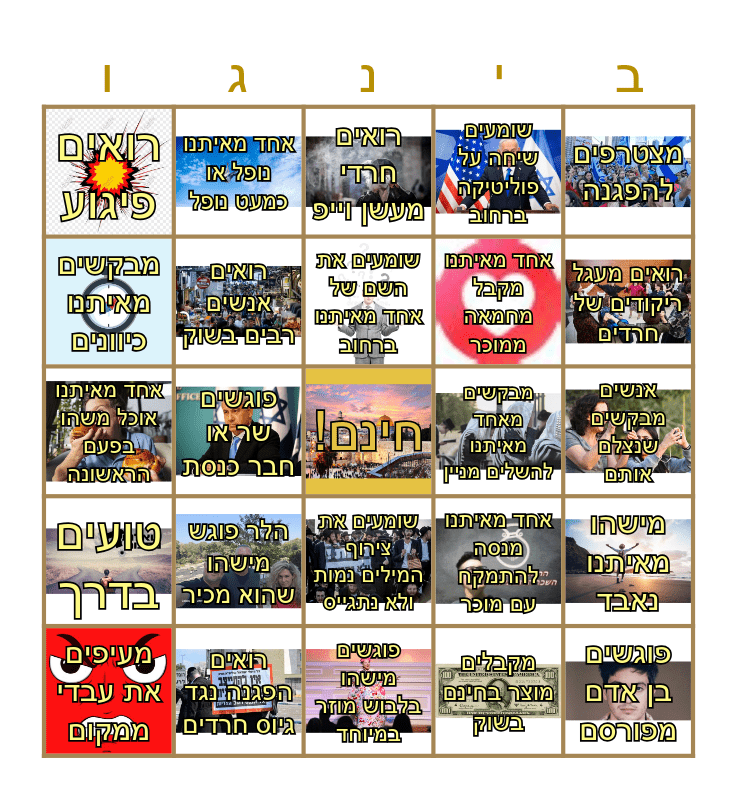 This bingo card has 29 images, a free space and 29 words: מעיפים את עבדי ממקום, עבדי יניח תפילין בכותל, פוגשים שר או חבר כנסת, שושקה קונה שוקו, רואים פיגוע, רואים חרדי מעשן וייפ, רואים אנשים רבים בשוק, הלר פוגש מישהו שהוא מכיר, מבקשים מאחד מאיתנו להשלים מניין, רואים הפגנה נגד גיוס חרדים, אנשים מבקשים שנצלם אותם, פוגשים בן אדם מפורסם, פוגשים מישהו בלבוש מוזר במיוחד, מקבלים מוצר בחינם בשוק, רואים מעגל ריקודים של חרדים, מצרפים מישהו לסיידקווסט, שומעים את צירוף המילים נמות ולא נתגייס, טועים בדרך, מצטרפים להפגנה, אחד מאיתנו אוכל משהו בפעם הראשונה, אחד מאיתנו מנסה להתמקח עם מוכר, שומעים מישהו מדבר בשפה זרה, אחד מאיתנו מקבל מחמאה ממוכר, מבקשים מאיתנו כיוונים, שומעים שיחה על פוליטיקה ברחוב, אחד מאיתנו נופל או כמעט נופל, מישהו מאיתנו נאבד, שומעים את השם של אחד מאיתנו ברחוב and שואלים אותנו מה השעה.