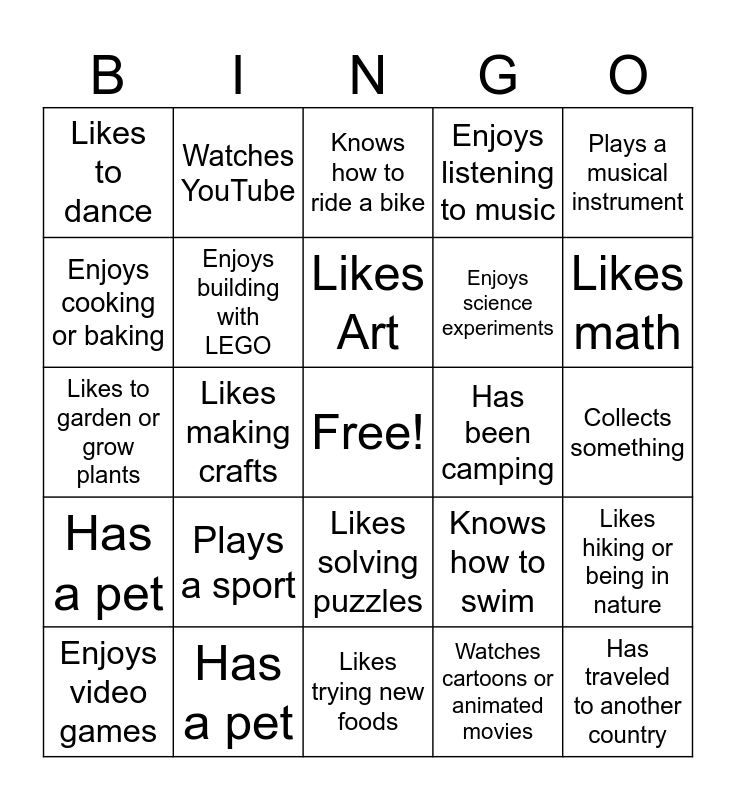 This bingo card has a free space and 24 words: Plays a sport, Has a pet, Likes Art, Enjoys video games, Plays a musical instrument, Likes to dance, Enjoys cooking or baking, Watches YouTube, Has been camping, Likes solving puzzles, Enjoys science experiments, Likes to garden or grow plants, Knows how to swim, Likes hiking or being in nature, Enjoys building with LEGO, Watches cartoons or animated movies, Collects something, Knows how to ride a bike, Likes math, Likes making crafts, Has traveled to another country, Has a pet, Enjoys listening to music and Likes trying new foods.