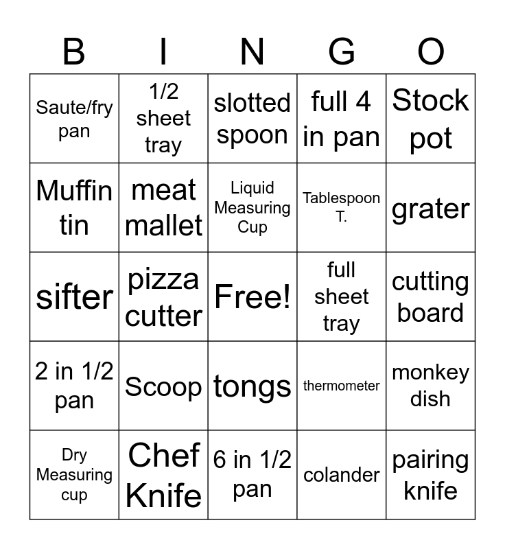 This bingo card has a free space and 24 words: Scoop, Chef Knife, Liquid Measuring Cup, Dry Measuring cup, Stock pot, Saute/fry pan, Muffin tin, 1/2 sheet tray, full sheet tray, tongs, Tablespoon T., sifter, thermometer, monkey dish, meat mallet, colander, cutting board, slotted spoon, grater, pizza cutter, pairing knife, 2 in 1/2 pan, full 4 in pan and 6 in 1/2 pan.