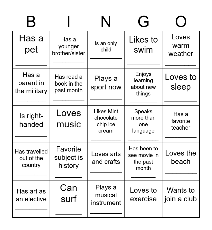 This bingo card has a free space and 24 words: Has art as an elective _________, Favorite subject is history _______, Plays a sport now ________, Loves to exercise ________, Loves warm weather ________, Has a pet ______, Has a younger brother/sister __________, is an only child ___________, Speaks more than one language __________, Has a favorite teacher __________, Is right-handed ________, Has read a book in the past month __________, Has been to see movie in the past month ________, Loves the beach ________, Has a parent in the military ________, Can surf _____, Plays a musical instrument _________, Likes to swim _______, Loves to sleep _______, Has travelled out of the country __________, Loves music ______, Loves arts and crafts _________, Enjoys learning about new things _________ and Wants to join a club _______.