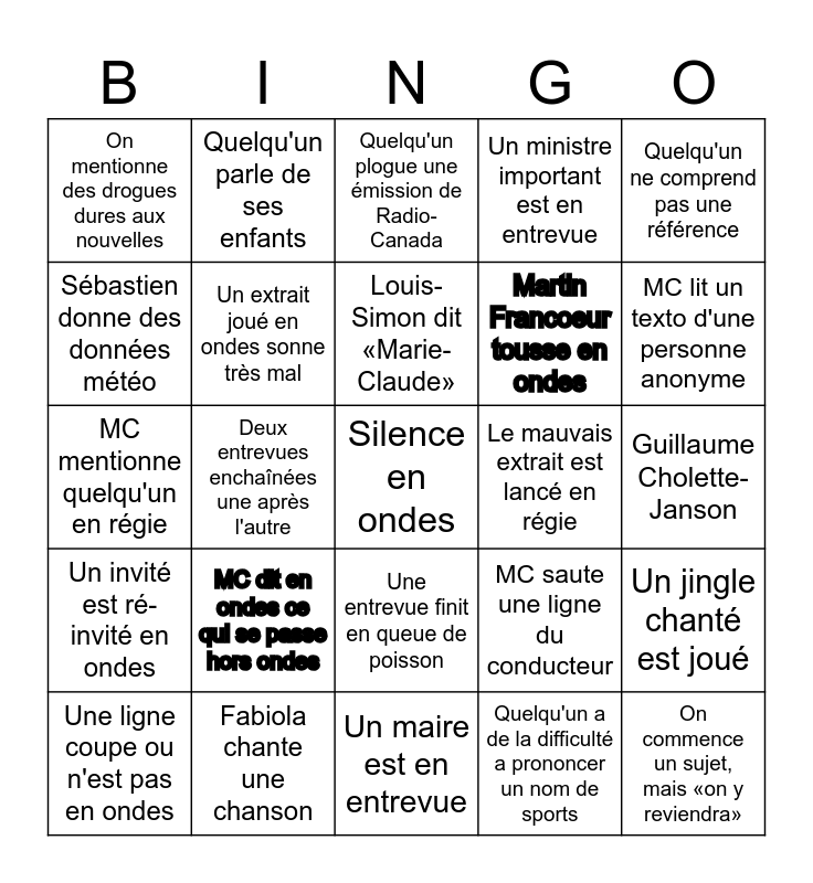 This bingo card has a free space and 24 words: MC dit en ondes ce qui se passe hors ondes, Fabiola chante une chanson, Louis-Simon dit «Marie-Claude», Une ligne coupe ou n'est pas en ondes, Quelqu'un ne comprend pas une référence, On mentionne des drogues dures aux nouvelles, Sébastien donne des données météo, Quelqu'un parle de ses enfants, Le mauvais extrait est lancé en régie, Une entrevue finit en queue de poisson, Martin Francoeur tousse en ondes, MC mentionne quelqu'un en régie, MC saute une ligne du conducteur, Un jingle chanté est joué, Un extrait joué en ondes sonne très mal, Quelqu'un a de la difficulté a prononcer un nom de sports, Guillaume Cholette-Janson, Quelqu'un plogue une émission de Radio-Canada, MC lit un texto d'une personne anonyme, Deux entrevues enchaînées une après l'autre, On commence un sujet, mais «on y reviendra», Un invité est ré-invité en ondes, Un ministre important est en entrevue and Un maire est en entrevue.