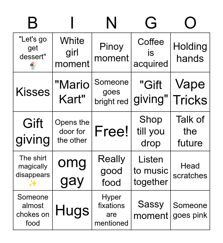 This bingo card has a free space and 24 words: omg gay, Hugs, Someone goes bright red, Someone almost chokes on food, Holding hands, "Let's go get dessert" 🍨, Kisses, White girl moment, Shop till you drop, Really good food, "Gift giving", Gift giving, Listen to music together, Head scratches, "Mario Kart", Sassy moment, Talk of the future, Pinoy moment, Vape Tricks, Opens the door for the other, Someone goes pink, The shirt magically disappears ✨, Coffee is acquired and Hyper fixations are mentioned.