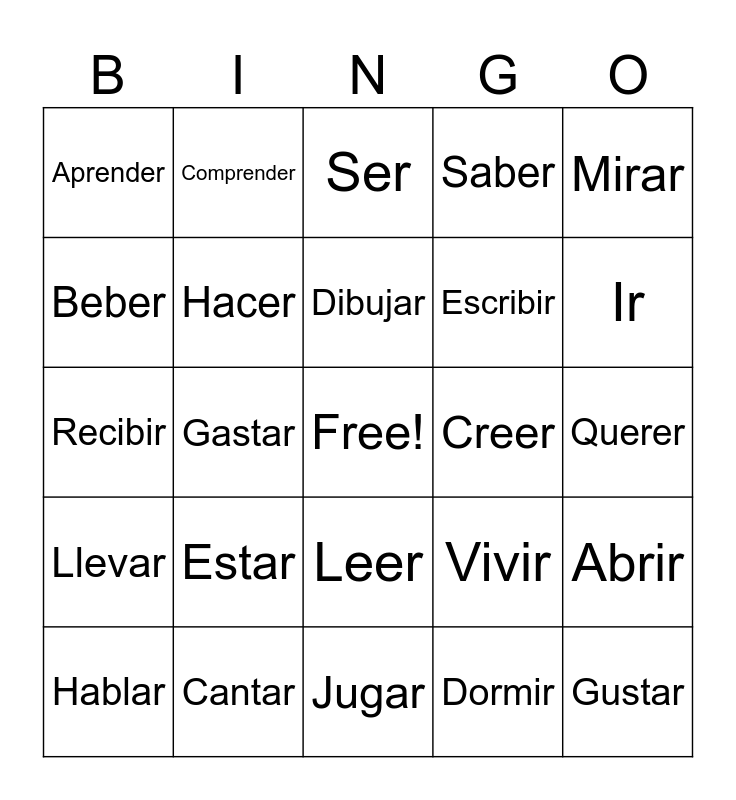 This bingo card has a free space and 24 words: Estar, Cantar, Dibujar, Hablar, Mirar, Aprender, Beber, Comprender, Creer, Leer, Escribir, Recibir, Vivir, Abrir, Hacer, Dormir, Querer, Ser, Ir, Gastar, Gustar, Llevar, Saber and Jugar.