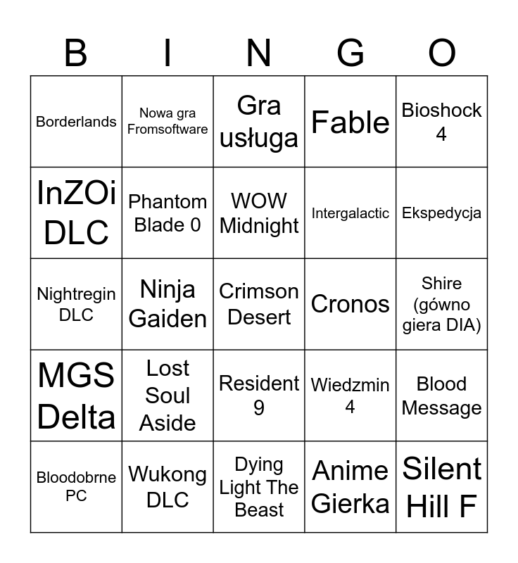 This bingo card has a free space and 24 words: Lost Soul Aside, Wukong DLC, WOW Midnight, Bloodobrne PC, Bioshock 4, Borderlands, InZOi DLC, Nowa gra Fromsoftware, Cronos, Resident 9, Intergalactic, Nightregin DLC, Wiedzmin 4, Blood Message, Phantom Blade 0, Anime Gierka, Shire (gówno giera DIA), Gra usługa, Ekspedycja, Ninja Gaiden, Silent Hill F, MGS Delta, Fable and Dying Light The Beast.