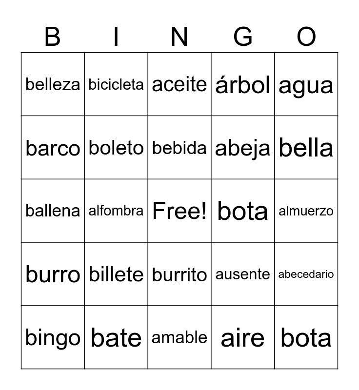 This bingo card has a free space and 24 words: billete, bate, bebida, bingo, agua, belleza, barco, bicicleta, bota, burrito, abeja, ballena, ausente, abecedario, boleto, aire, almuerzo, aceite, bella, alfombra, bota, burro, árbol and amable.