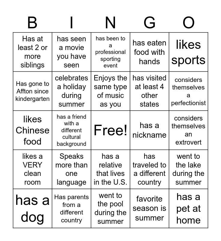 This bingo card has a free space and 24 words: Speaks more than one language, Has parents from a different country, Enjoys the same type of music as you, has a dog, likes sports, Has at least 2 or more siblings, Has gone to Affton since kindergarten, has seen a movie you have seen, has a nickname, has a relative that lives in the U.S., has visited at least 4 other states, likes Chinese food, has traveled to a different country, went to the lake during the summer, celebrates a holiday during summer, favorite season is summer, considers themselves an extrovert, has been to a professional sporting event, considers themselves a perfectionist, has a friend with a different cultural background, has a pet at home, likes a VERY clean room, has eaten food with hands and went to the pool during the summer.