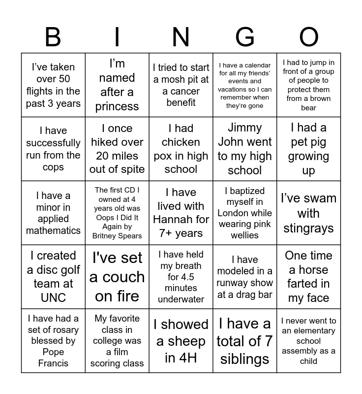 This bingo card has a free space and 24 words: I've set a couch on fire, My favorite class in college was a film scoring class, I had chicken pox in high school, I have had a set of rosary blessed by Pope Francis, I had to jump in front of a group of people to protect them from a brown bear, I’ve taken over 50 flights in the past 3 years, I have successfully run from the cops, I’m named after a princess, I baptized myself in London while wearing pink wellies, I have held my breath for 4.5 minutes underwater, Jimmy John went to my high school, I have a minor in applied mathematics, I have modeled in a runway show at a drag bar, One time a horse farted in my face, I once hiked over 20 miles out of spite, I have a total of 7 siblings, I’ve swam with stingrays, I tried to start a mosh pit at a cancer benefit, I had a pet pig growing up, The first CD I owned at 4 years old was Oops I Did It Again by Britney Spears, I never went to an elementary school assembly as a child, I created a disc golf team at UNC, I have a calendar for all my friends’ events and vacations so I can remember when they’re gone and I showed a sheep in 4H.