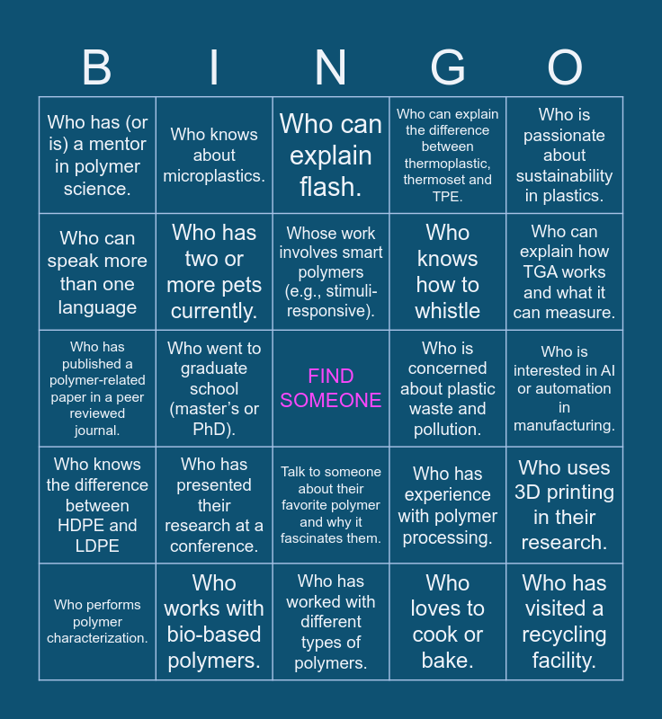 This bingo card has a free space and 25 words: Who has presented their research at a conference., Who has worked with different types of polymers., Whose work involves smart polymers (e.g., stimuli-responsive)., Who performs polymer characterization., Who is passionate about sustainability in plastics., Who has (or is) a mentor in polymer science., Who can speak more than one language, Who knows about microplastics., Who is concerned about plastic waste and pollution., Talk to someone about their favorite polymer and why it fascinates them., Who knows how to whistle, Who has published a polymer-related paper in a peer reviewed journal., Who has experience with polymer processing., Who uses 3D printing in their research., Who has two or more pets currently., Who can define a polymer., Who is interested in AI or automation in manufacturing., Who can explain flash., Who can explain how TGA works and what it can measure., Who went to graduate school (master’s or PhD)., Who has visited a recycling facility., Who works with bio-based polymers., Who knows the difference between HDPE and LDPE, Who can explain the difference between thermoplastic, thermoset and TPE. and Who loves to cook or bake..