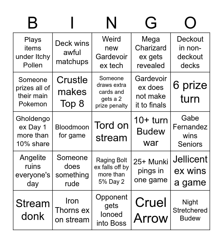 This bingo card has a free space and 24 words: Someone does something rude, Iron Thorns ex on stream, Someone draws extra cards and gets a 2 prize penalty, Stream donk, Deckout in non-deckout decks, Plays items under Itchy Pollen, Someone prizes all of their main Pokemon, Deck wins awful matchups, 10+ turn Budew war, Raging Bolt ex falls off by more than 5% Day 2, Gardevoir ex does not make it to finals, Gholdengo ex Day 1 more than 10% share, 25+ Munki pings in one game, Jellicent ex wins a game, Crustle makes Top 8, Cruel Arrow, Gabe Fernandez wins Seniors, Weird new Gardevoir ex tech, 6 prize turn, Bloodmoon for game, Night Stretchered Budew, Angelite ruins everyone's day, Mega Charizard ex gets revealed and Opponent gets Ionoed into Boss.