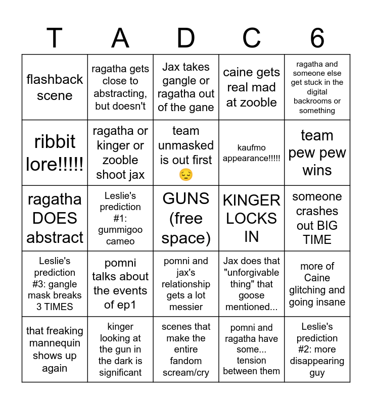 This bingo card has a free space and 24 words: pomni talks about the events of ep1, kinger looking at the gun in the dark is significant, team unmasked is out first 😔, that freaking mannequin shows up again, ragatha and someone else get stuck in the digital backrooms or something, flashback scene, ribbit lore!!!!!, ragatha gets close to abstracting, but doesn't, KINGER LOCKS IN, pomni and jax's relationship gets a lot messier, kaufmo appearance!!!!!, ragatha DOES abstract, Jax does that "unforgivable thing" that goose mentioned..., more of Caine glitching and going insane, ragatha or kinger or zooble shoot jax, pomni and ragatha have some... tension between them, someone crashes out BIG TIME, Jax takes gangle or ragatha out of the gane, team pew pew wins, Leslie's prediction #1: gummigoo cameo, Leslie's prediction #2: more disappearing guy, Leslie's prediction #3: gangle mask breaks 3 TIMES, caine gets real mad at zooble and scenes that make the entire fandom scream/cry.