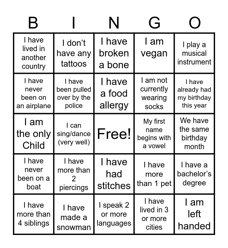 This bingo card has a free space and 24 words: I have more than 2 piercings, I have made a snowman, I have a food allergy, I have more than 4 siblings, I play a musical instrument, I have lived in another country, I have never been on an airplane, I don’t have any tattoos, My first name begins with a vowel, I have had stitches, I am not currently wearing socks, I am the only Child, I have more than 1 pet, I have a bachelor’s degree, I have been pulled over by the police, I have lived in 3 or more cities, We have the same birthday month, I have broken a bone, I have already had my birthday this year, I can sing/dance (very well), I am left handed, I have never been on a boat, I am vegan and I speak 2 or more languages.