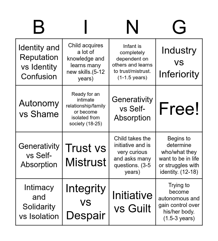 This bingo card has 18 words: Trust vs Mistrust, Trying to become autonomous and gain control over his/her body. (1.5-3 years), Infant is completely dependent on others and learns to trust/mistrust. (1-1.5 years), Identity and Reputation vs Identity Confusion, Child takes the initiative and is very curious and asks many questions. (3-5 years), Industry vs Inferiority, Intimacy and Solidarity vs Isolation, Child acquires a lot of knowledge and learns many new skills.(5-12 years), Free!, Generativity vs Self-Absorption, Initiative vs Guilt, Autonomy vs Shame, Begins to determine who/what they want to be in life or struggles with identity. (12-18), Ready for an intimate relationship/family or become isolated from society (18-25), Generativity vs Self-Absorption, People will either be productive or negative (25-65), Integrity vs Despair and Person will either feel accomplished or regret (65+).