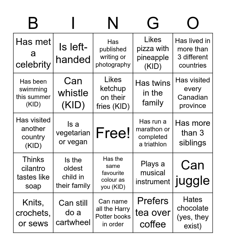 This bingo card has a free space and 35 words: Has a pet (KID), Likes ice cream better than cake (KID), Can do a cartwheel (KID), Can whistle (KID), Has the same favourite colour as you (KID), Likes pizza with pineapple (KID), Has been swimming this summer (KID), Can make a silly face (KID), Likes ketchup on their fries (KID), Can make an animal sound (KID), Has visited another country (KID), Has lived in more than 3 different countries, Was born in the same month as you, Has a birthday in December, Has met a celebrity, Has run a marathon or completed a triathlon, Prefers tea over coffee, Is a vegetarian or vegan, Thinks cilantro tastes like soap, Hates chocolate (yes, they exist), Plays a musical instrument, Knits, crochets, or sews, Can juggle, Can still do a cartwheel, Has published writing or photography, Has visited every Canadian province, Has been scuba diving, Has taken a hot air balloon ride, Has twins in the family, Has more than 3 siblings, Shares a first name with someone else here, Can name all the Harry Potter books in order, Is the oldest child in their family, Is left-handed and Can recite part of a poem or song from memory.