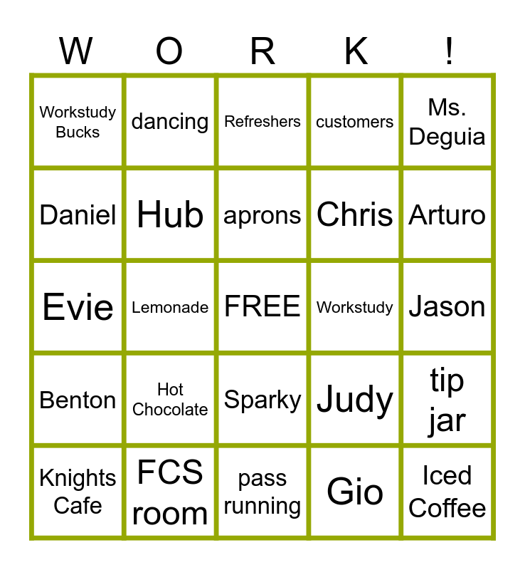 This bingo card has a free space and 29 words: Knights Cafe, Recycling, Lemonade, Coffee, Workstudy Bucks, Refreshers, Hub, Hot Chocolate, Workstudy, FCS room, Jason, Iced Coffee, pass running, Gio, Arturo, Mrs. Stacey, Sparky, Benton, Ms. Deguia, Evie, Judy, Ben, Chris, Daniel, customers, dancing, tip jar, aprons and whipped cream.