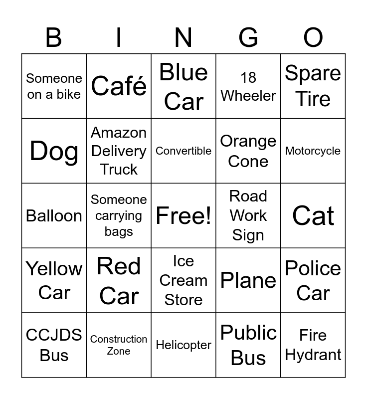 This bingo card has a free space and 24 words: Red Car, Construction Zone, Convertible, CCJDS Bus, Spare Tire, Someone on a bike, Dog, Café, Road Work Sign, Ice Cream Store, Orange Cone, Balloon, Plane, Police Car, Amazon Delivery Truck, Public Bus, Cat, Blue Car, Motorcycle, Someone carrying bags, Fire Hydrant, Yellow Car, 18 Wheeler and Helicopter.