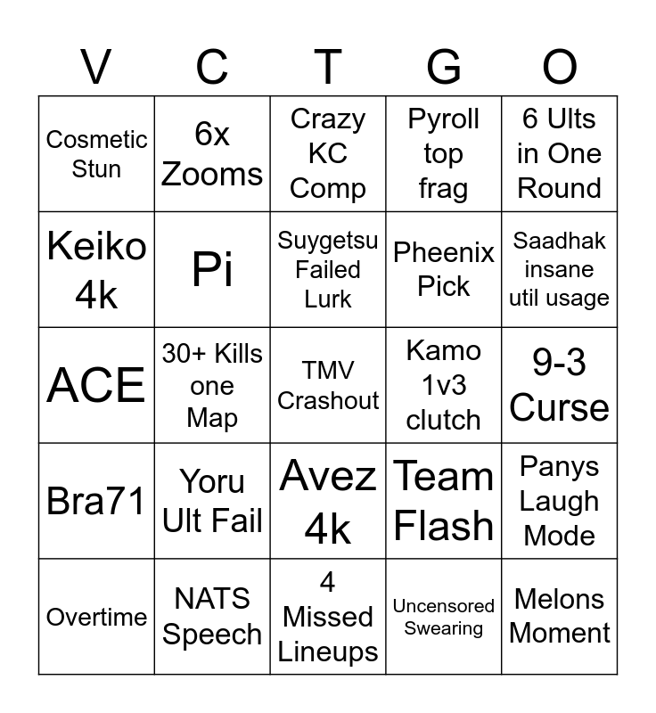 This bingo card has a free space and 24 words: Yoru Ult Fail, NATS Speech, Suygetsu Failed Lurk, Overtime, 6 Ults in One Round, Cosmetic Stun, Keiko 4k, 6x Zooms, Kamo 1v3 clutch, Avez 4k, Pheenix Pick, ACE, Team Flash, Panys Laugh Mode, Pi, Uncensored Swearing, 9-3 Curse, Crazy KC Comp, Saadhak insane util usage, 30+ Kills one Map, Melons Moment, Bra71, Pyroll top frag and 4 Missed Lineups.