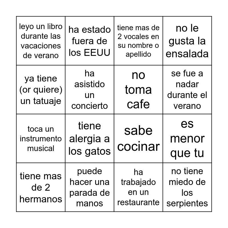 This bingo card has 16 words: tiene mas de 2 hermanos, puede hacer una parada de manos, tiene mas de 2 vocales en su nombre o apellido, no le gusta la ensalada, ya tiene (or quiere) un tatuaje, ha estado fuera de los EEUU, sabe cocinar, es menor que tu, leyo un libro durante las vacaciones de verano, ha asistido un concierto, ha trabajado en un restaurante, se fue a nadar durante el verano, toca un instrumento musical, tiene alergia a los gatos, no toma cafe and no tiene miedo de los serpientes.